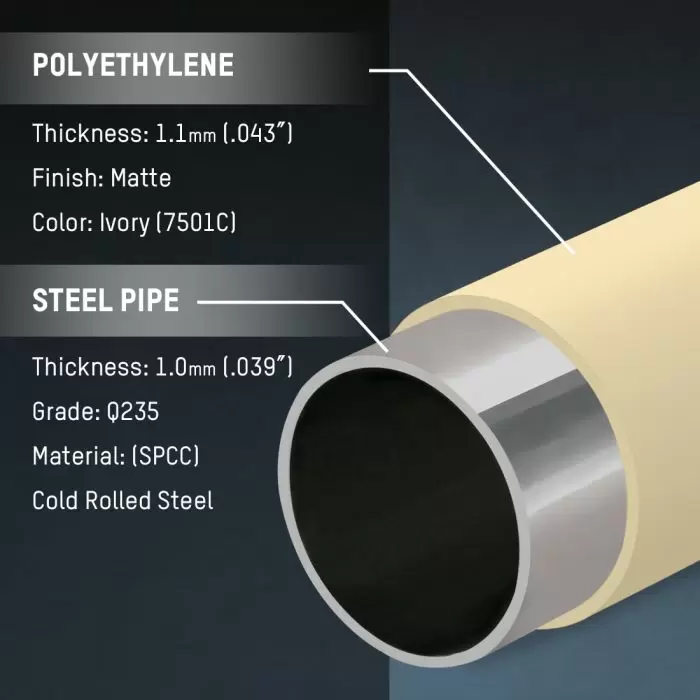 The P-96-IV is an 8 ft steel pipe coated in polyethylene, built for lean manufacturing flexibility. Its 28 mm outer diameter supports a wide range of modular applications. The ivory finish is suited for controlled or cold storage settings, and its rugged construction withstands repetitive use in U.S. industrial environments.